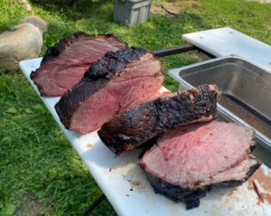 Beef Roasts include a 30-40 lb. steamship round, slow cooked over wood & charcoal at a grill temperature between 225-250 degrees for 4-6 hours. Our roasts are seasoned with our special rub and thinly sliced. Served with smoke flavored au jus.